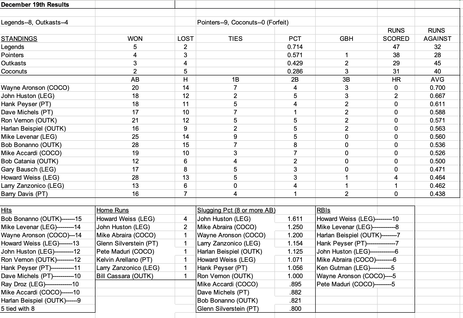 Stickball Weekly Statistics